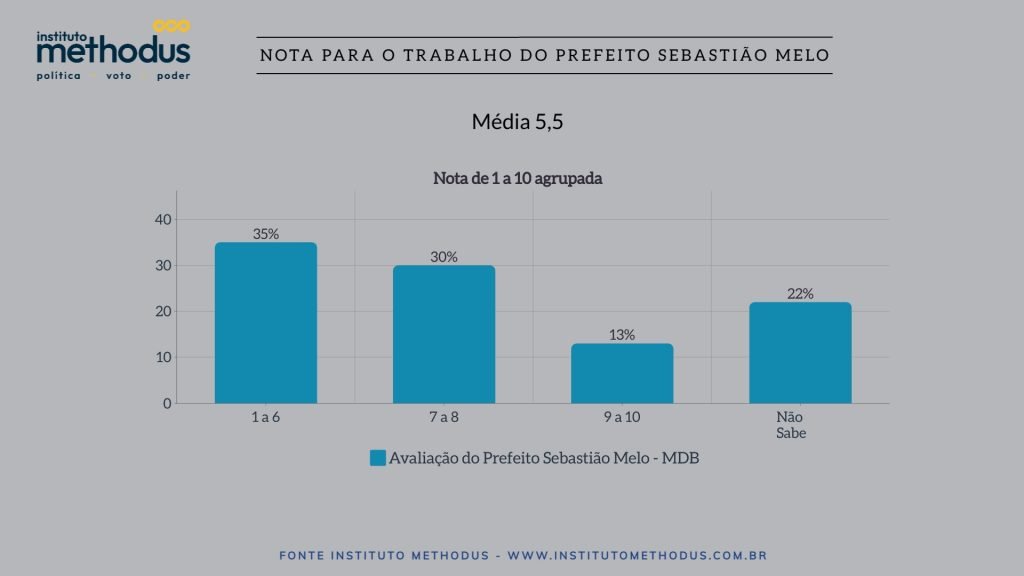 Agora, iremos agrupar os resultados das justificativas, reunindo as notas e suas respectivas respostas, formando subgrupos qualitativos de notas. As notas de um a seis (1 a 6) correspondem a 35% dos entrevistados e recebem justificativas similares, para esta parcela dos eleitores o prefeito Sebastião Melo – MDB: