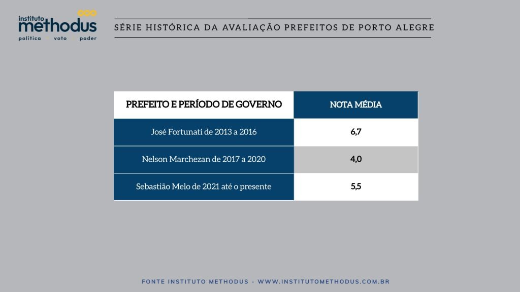 Como verificamos, o Prefeito de Porto Alegre Sebastião Melo obtém média 5,5, principalmente porque a maioria dos eleitores não percebe mudanças na cidade ou em seus bairros, para eles, nada mudou e Porto Alegre não se resume apenas a orla do Guaíba. Devemos ainda relembrar, o atual Prefeito foi eleito com a menor votação nominal dos últimos 16 anos na Capital, o que afeta sua avaliação, pois a maioria dos porto-alegrenses não optou por Sebastião Melo em 2020.